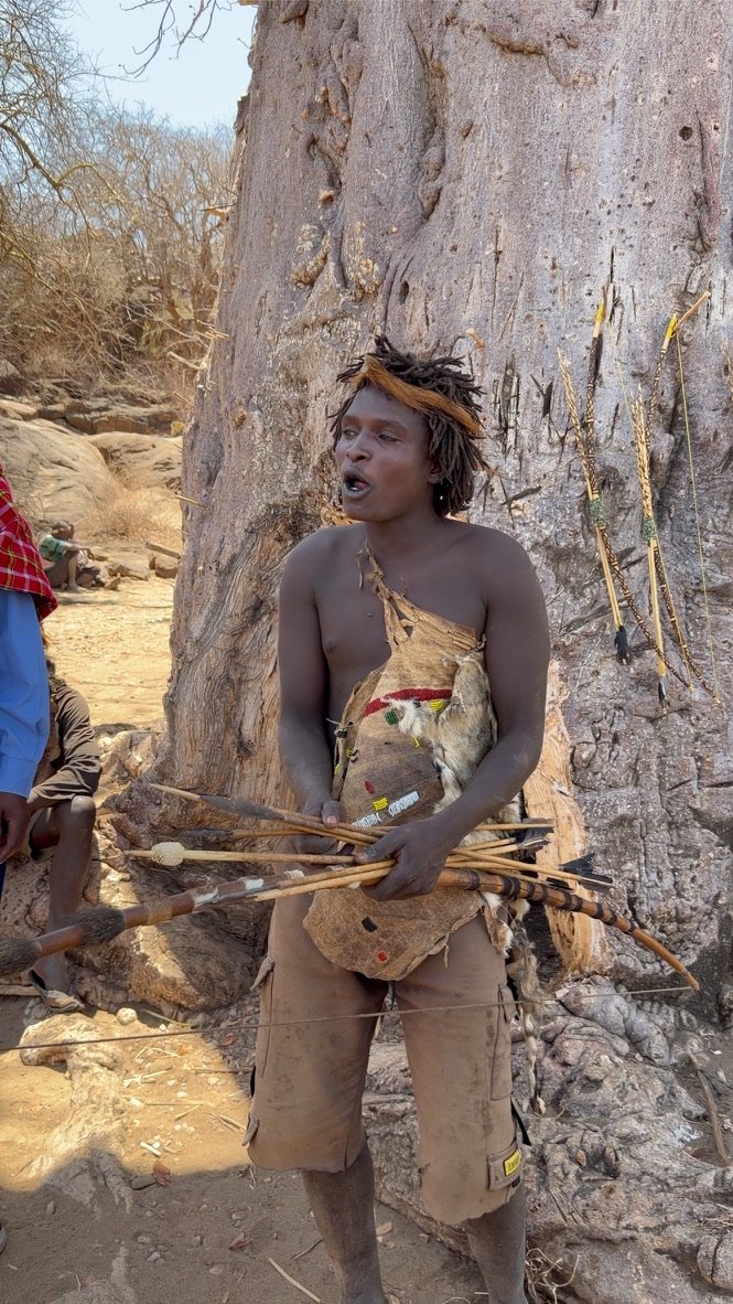 The Hadzabe bushman live in caves and eat whatever they hunt or forage. The tribe trades honey and bush meat with the Datonga tribe for the arrowheads which they then attach to wooden sticks to make arrows.
