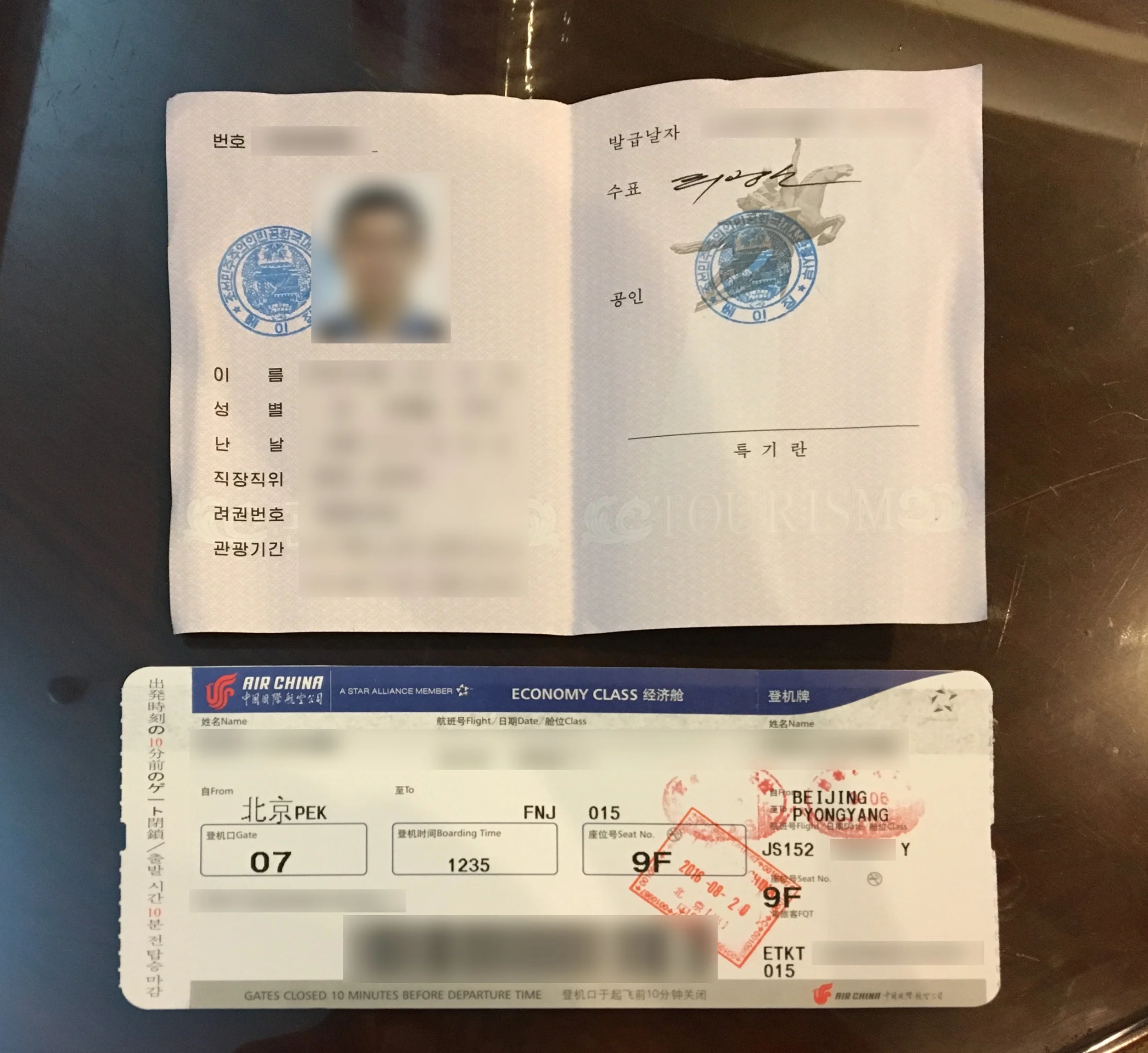 DPRK tourist visa card and Air Koryo boarding pass