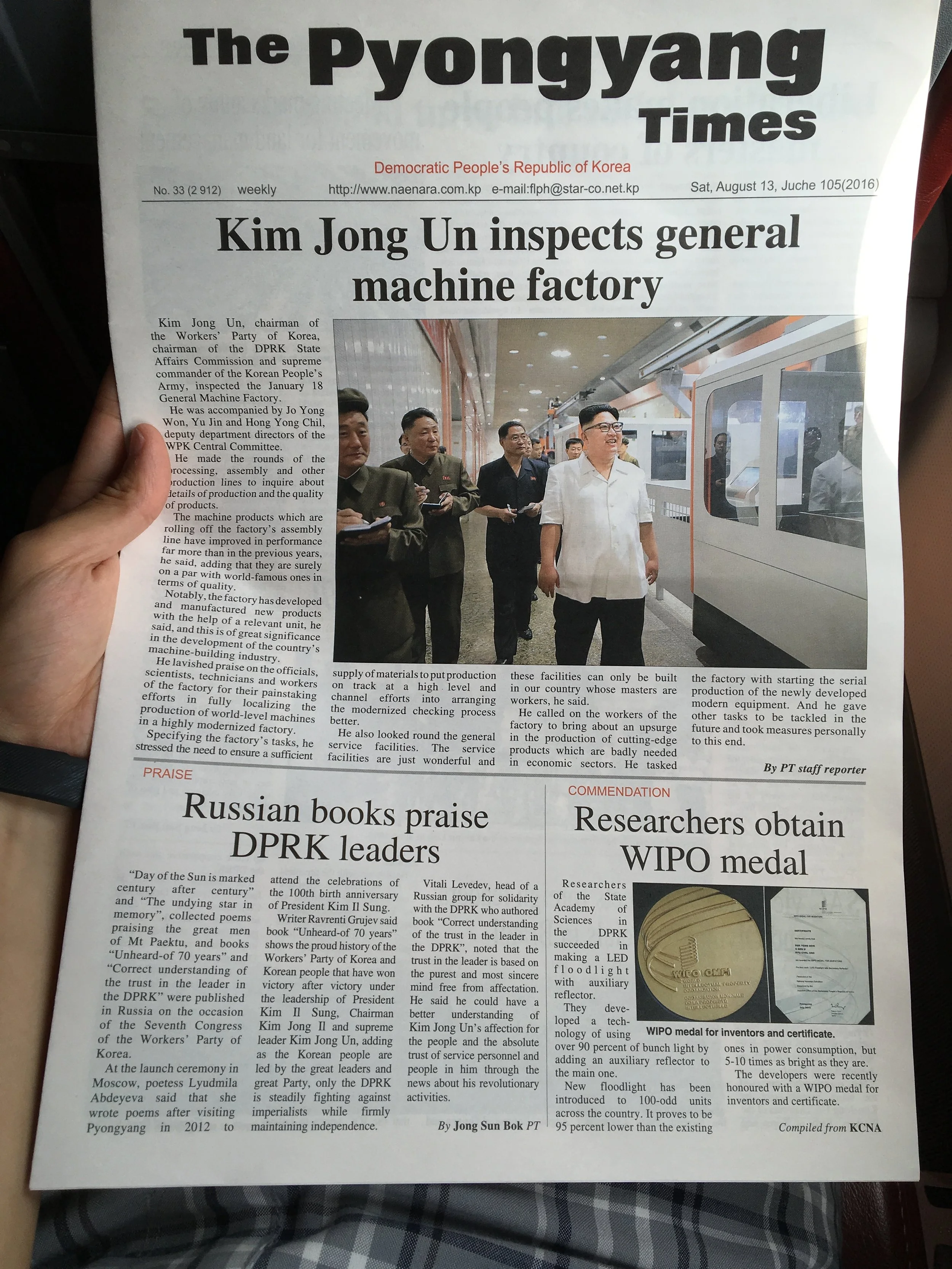 As we boarded the plane, I took one last look at freedom with the Soviet-era plane before picking up a copy of the Pyongyang Times at the gate. That newspaper, more like a propaganda pamphlet, served as my inflight entertainment for the next hour and half.