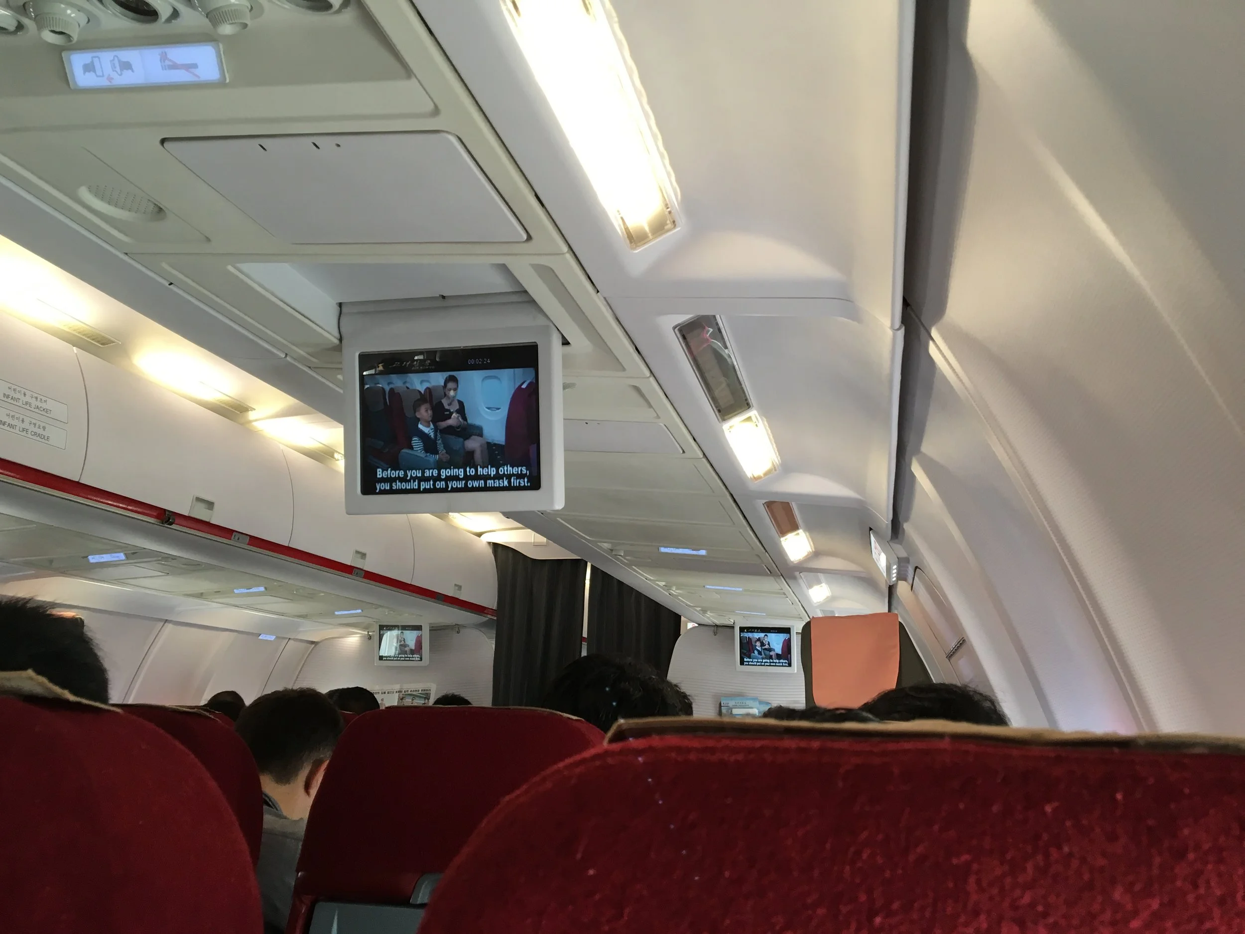 We watched an extremely boring safety video and were on our way. Our departure was on time to the exact minute. That lady in the safety video? She was actually our flight attendant. Only in North Korea.