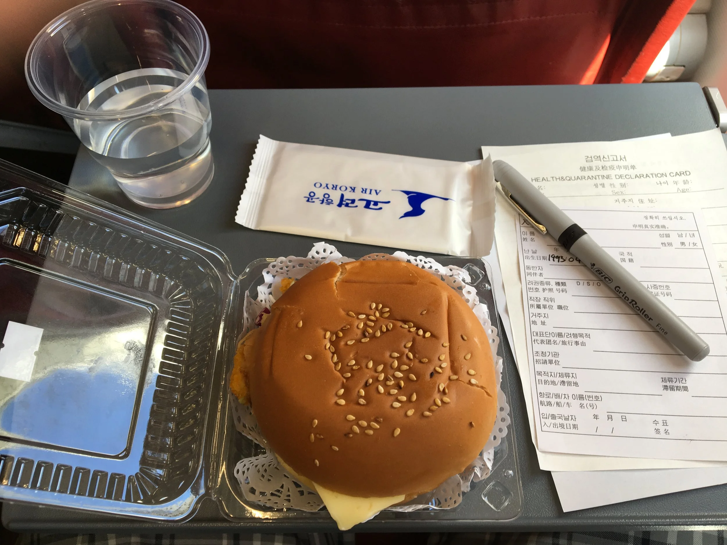 Chicken sandwich lunch and customs forms aboard Air Koryo