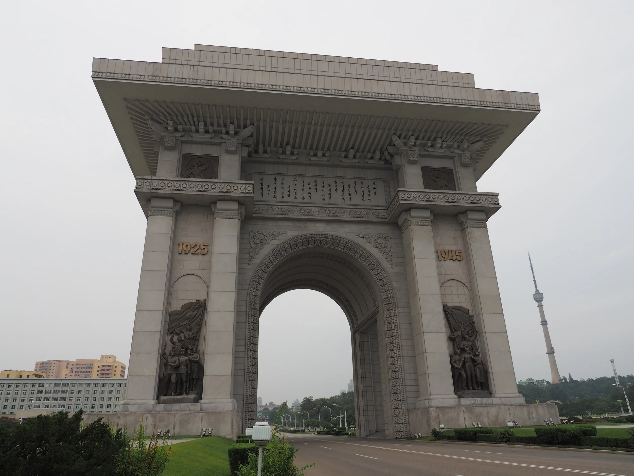 First stop, Arch of Triumph. It's really like they copied the one in Paris and made it communist. The arch was built to commemorate the Korean resistance to Japanese rule from 1925 to 1945. That tower on the left is the Pyongyang TV tower and there were lots of government buildings surrounding the arch.