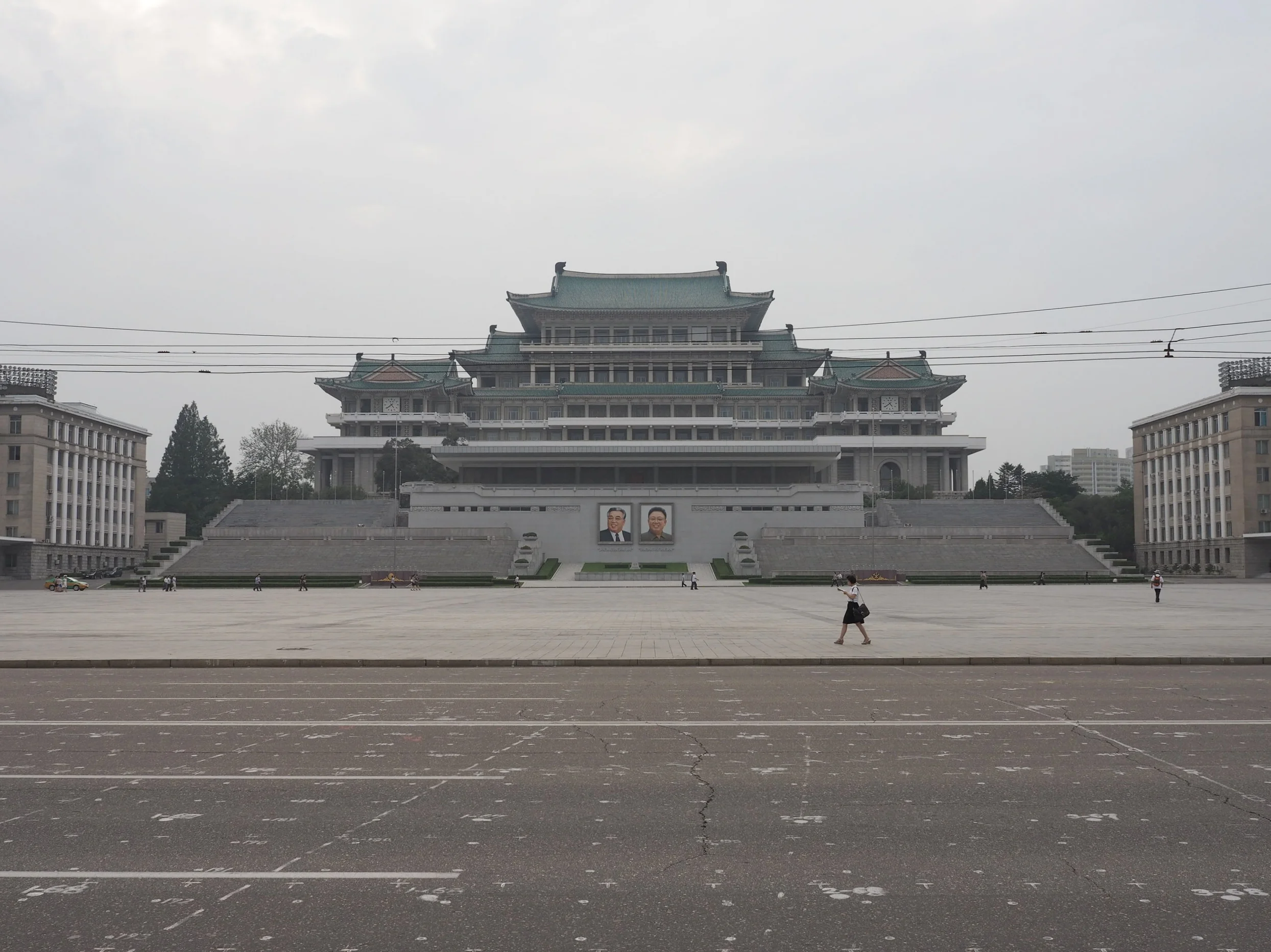 We walk over the the main square where the Grand People's Study House faces the river and the Juche Tower. The dots on the ground are for marking positions during the military parades that take place here. What a strange place to be.
