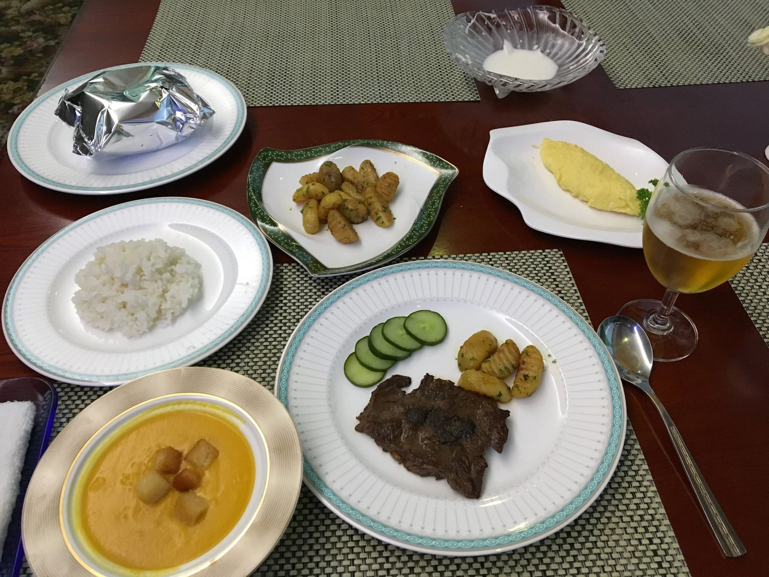 The meal isn't half bad, except it's what I'd expect if someone never had Western food and tried to make it from a cookbook. The salad was quite good actually, reminds me a little bit of Japanese salads from bento boxes. I had a pumpkin soup with stale croutons, grilled potatoes with strange spices, a delicious egg omelette, tuna wrapped in foil, and an overcooked lamb steak with rice. It was definitely a lot of food, but really the only thing amazing was the rice. There's a Chinese saying that the best rice from Northern China. I think this is what they meant.