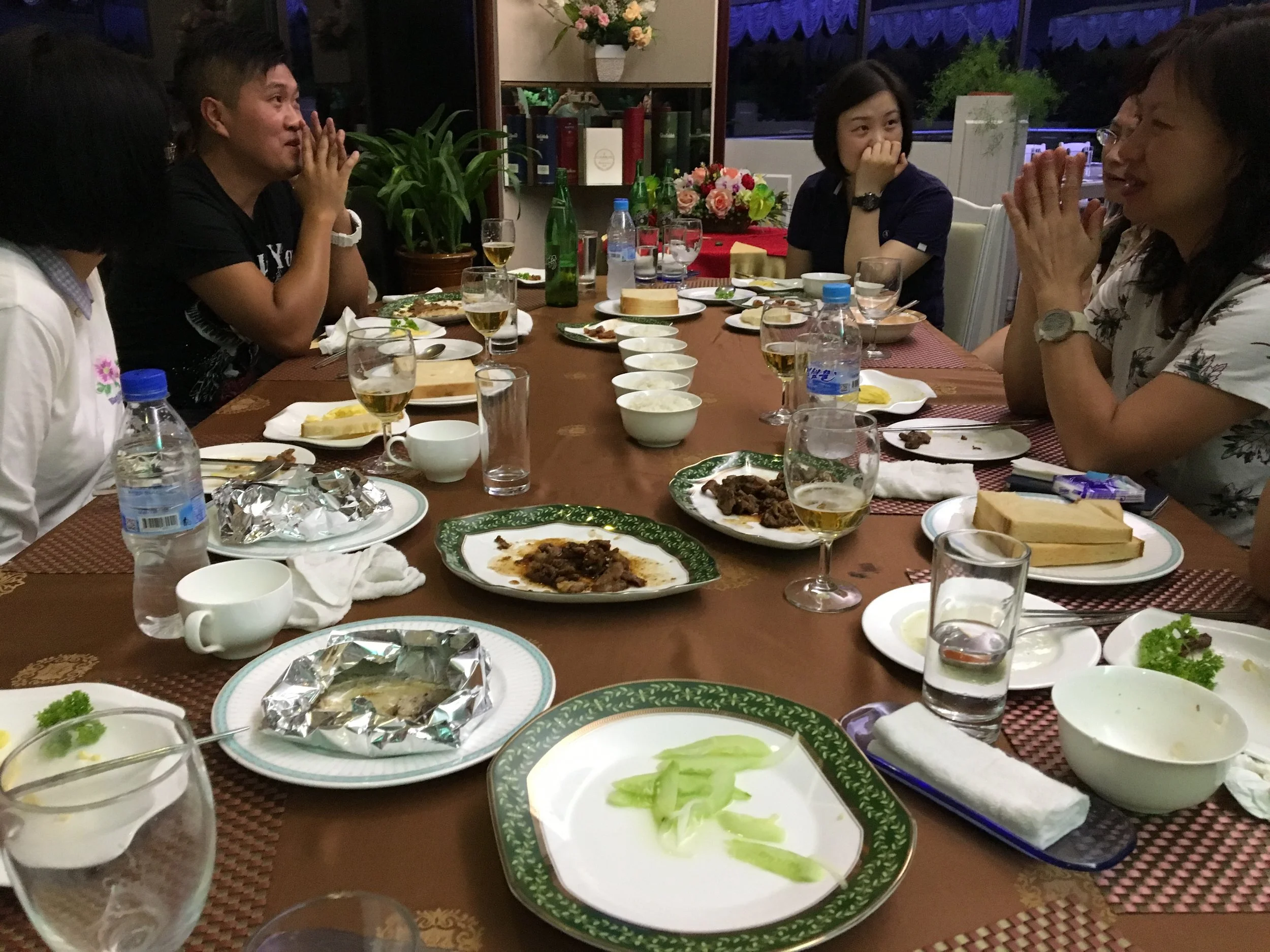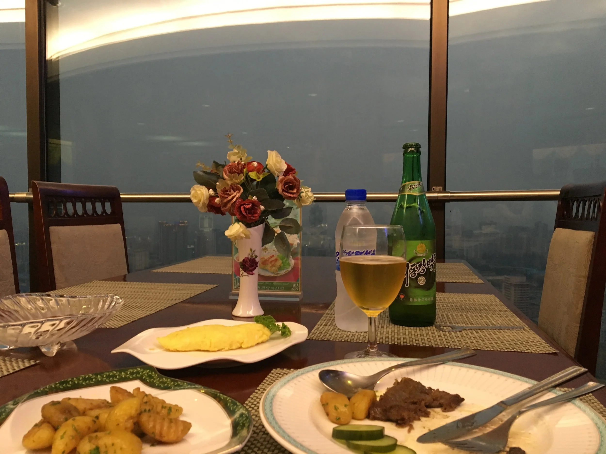 This is the start of a few very lonely meals I will have in North Korea. It seems like the guides do attempt to isolate travelers and assign time slots to each group. I'm usually the only one at the restaurant. My first dinner in North Korea is at the top of the hotel in their revolving restaurant. I was told not to take any pictures, but since I was the only person in the restaurant aside from the waitress, it was easy to sneak one in. There's not much to see out the window.